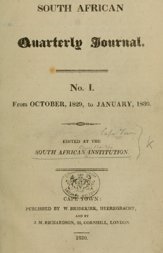 Vol. 2 No. 1 (1835)The second volume of the South African Quarterly Journal, edited at The South African Literary and Scientific Institution, printed at the 'Albion Press,’ Grave-street; and published by A.S. Robertson, Shortmarket Street and J.M. Richardson, 23, Cornhill, London.